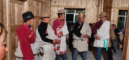 夜臨了,月低垂,整條山谷陷入了藍(lán)色的世界,近處是墨綠,遠(yuǎn)處是淡綠,雄渾的大山在綠的撫摸下也變得婀娜起來(lái);古老寨子的火塘也燃起來(lái)了,勞作了一天的普米人聚在一起,跳起了原始氏族人群圍火而舞的傳統(tǒng)舞蹈,曲調(diào)悠揚(yáng)且古樸動(dòng)人。
