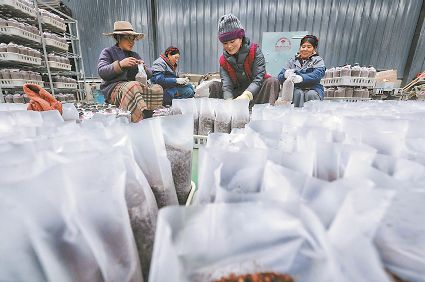 還有村民進(jìn)了產(chǎn)業(yè)園務(wù)工。帕他志瑪、扎西翁姆、白瑪、確志、斯郎卓呷都在產(chǎn)業(yè)園務(wù)工,月平均收入可達(dá)3000元以上。在八角樓鄉(xiāng),像帕他志瑪這樣在“家門(mén)口”打工、全家人掙錢(qián)的當(dāng)?shù)卮迕窦彝ゲ辉谏贁?shù)。40多位村民在產(chǎn)業(yè)園長(zhǎng)期就業(yè),100多位村民參與產(chǎn)業(yè)園的季節(jié)性就業(yè),這都帶動(dòng)了松茸村、木澤西村、維地村的貧困群眾實(shí)現(xiàn)高質(zhì)量脫貧。現(xiàn)代立體高效食用菌產(chǎn)業(yè)的建立讓當(dāng)?shù)卮迕竦谝淮螄L到了一天掙上百塊錢(qián)的甜頭。