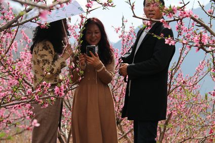 這個(gè)時(shí)節(jié),著名的賞花之地當(dāng)屬瀘定縣冷磧鎮(zhèn)杵坭的桃花谷。從瀘定縣城出發(fā),沿著大渡河右岸一路往下,行約20分鐘就能看到美麗的田野景色。只見(jiàn),山頭上,田野間,或是房前屋后,統(tǒng)統(tǒng)換上了美麗誘人的春裝。放眼望去,李花、桃花、油菜花競(jìng)相綻放,爭(zhēng)奇斗艷。這里,桃花尤其繁盛,沿著山谷錯(cuò)落有致、次第盛開(kāi),讓人目不暇接,用一步一景來(lái)形容也一點(diǎn)不為過(guò)。