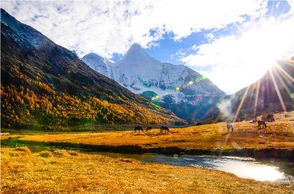從稻城前往亞丁的路上會(huì)穿越川西風(fēng)光最美的彩色林帶,領(lǐng)略神奇的四季更替;洛絨牛場上的移動(dòng)牧群點(diǎn)綴在一片金黃之中,猶如浮動(dòng)的云朵,煞是好看。