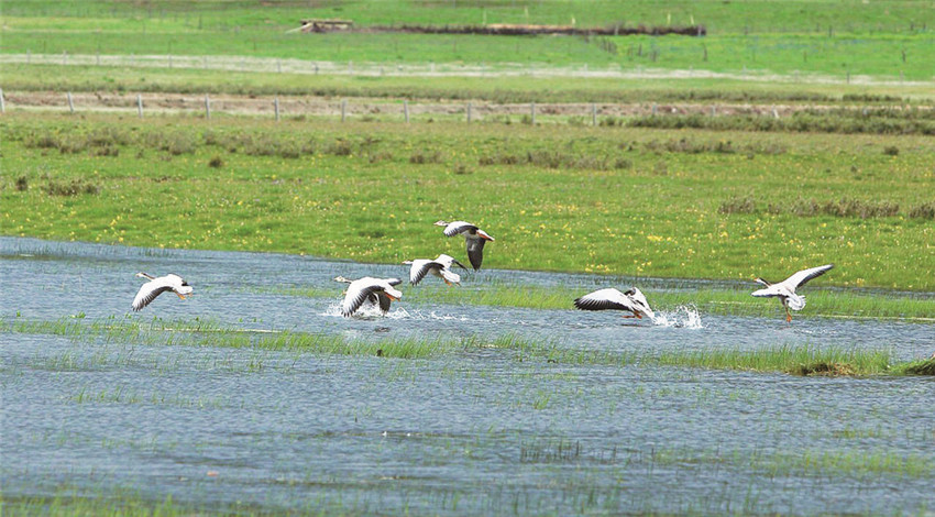 拉龍措古冰漂濕地旅游景區(qū)里有近百種植被,以及黑頸鶴、黑鸛、金雕、胡兀鷲等鳥(niǎo)類(lèi)動(dòng)物。陽(yáng)光下的拉龍措,波光粼粼,斑頭雁在湖面“飛舞”,潔白的羽毛伸展后露出圍繞的黑邊,宛若芭蕾舞者在湖面起舞……