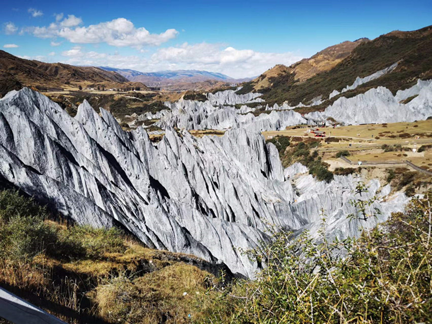 墨石公園的石林,分布在雅礱江支流慶大河的東側(cè)坡地上,川藏公路從旁經(jīng)過(guò)。離開公路,沿一條小路行幾百米,就是觀景臺(tái)。