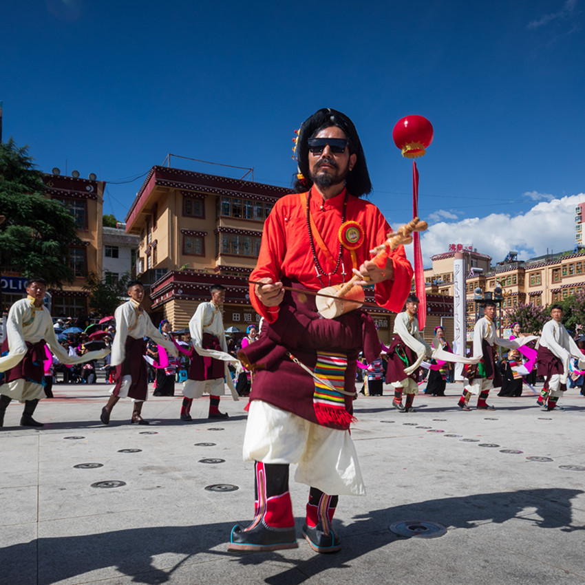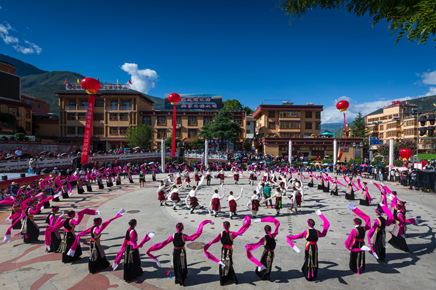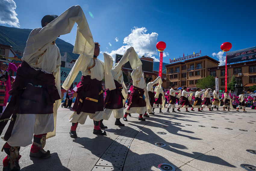 金弦子廣場,舞者們仿若守護者一般,圍著金黃色的弦子雕塑,或輕歌曼舞或昂揚踏步,斑斕的畢旺、搖曳的流蘇和飄逸的紅袖與花共舞,與景相映,聲聲吟唱、步步踏尋,是追憶更是誓言。