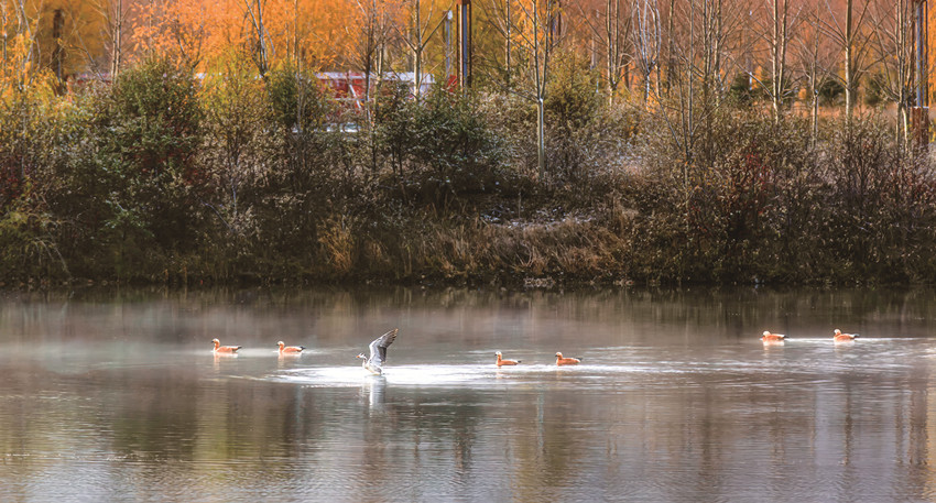 近年來(lái),到珠姆湖越冬的候鳥(niǎo)越來(lái)越多,有赤麻鴨、綠頭鴨、秋沙鴨、斑頭雁、鸕鶿等,讓冬季的雅礱林卡濕地公園熱鬧非凡。