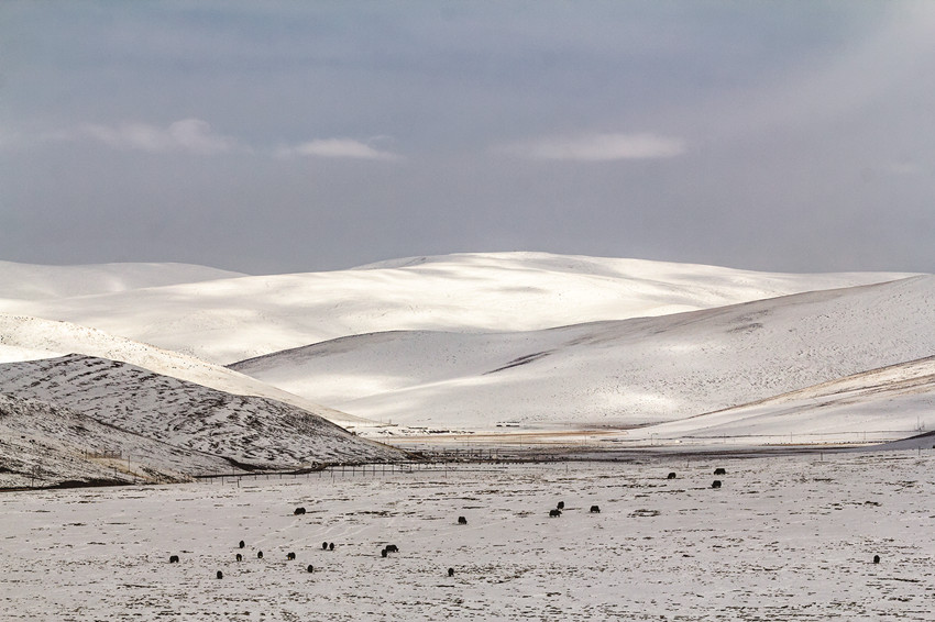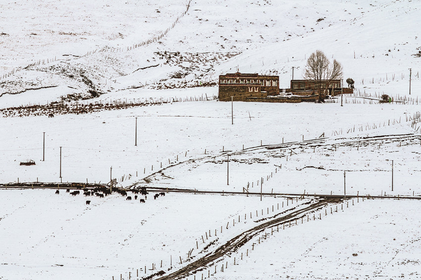 雪后的高原,藍天白云,大地和連綿到天邊的遠山,就像被什么過濾了一樣,一片潔白,滿眼凈是純凈的美,全然沒有冬日的荒涼,更顯空靈、大氣,盡顯高原獨特的美。白雪覆蓋的村莊、牧場被河流、大路小徑串連起來,寧靜、秀美,像一幅幅天然的水墨畫,美不勝收。