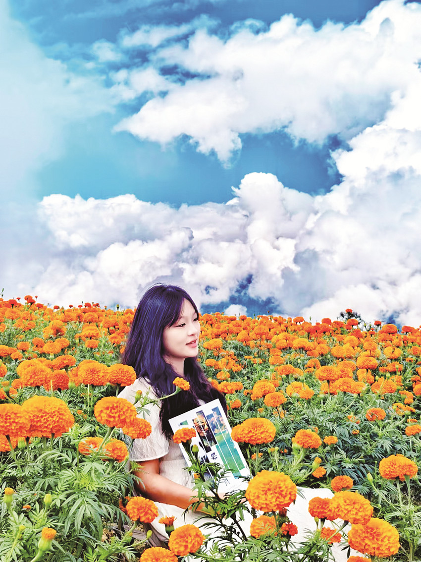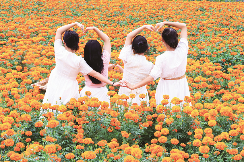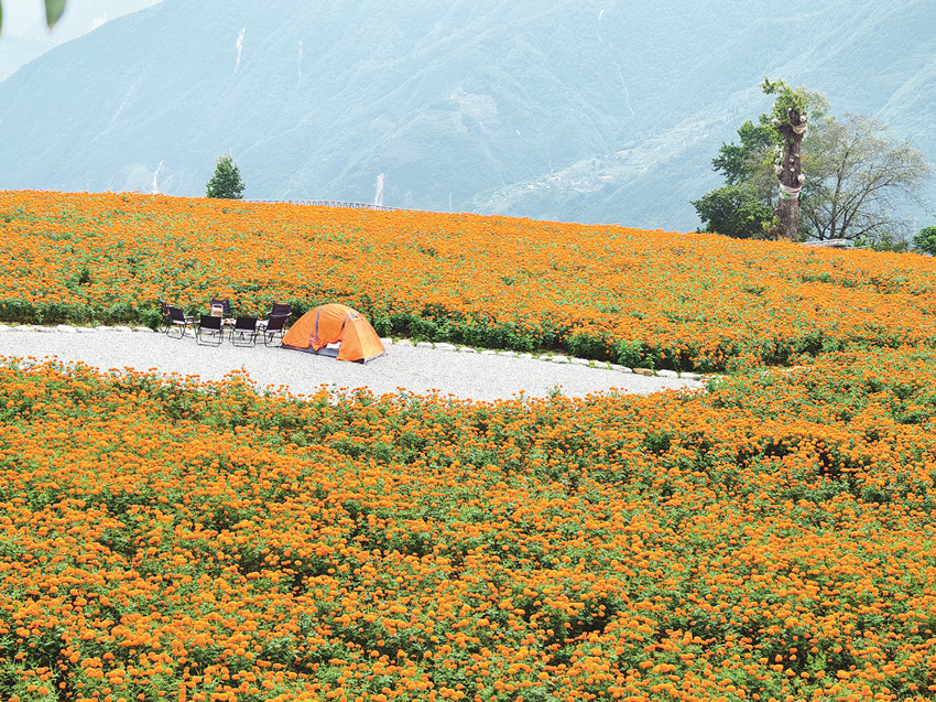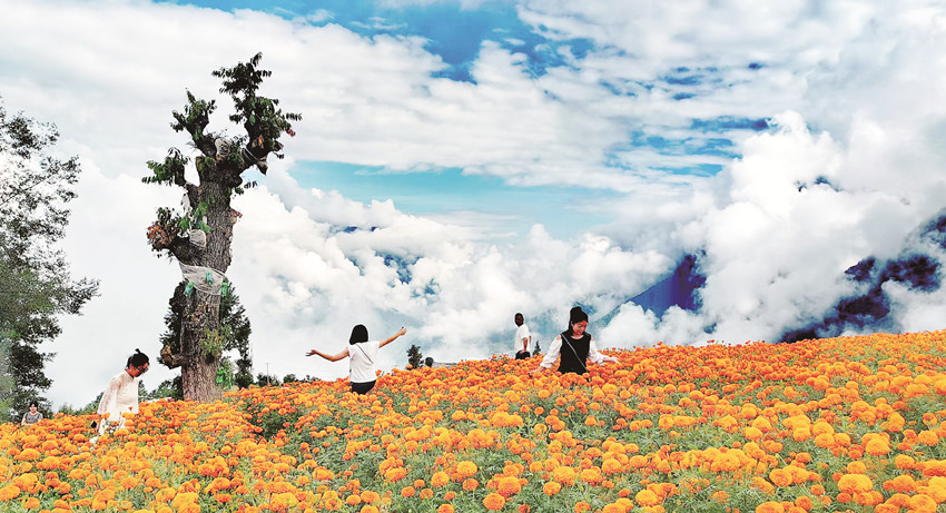 在這金風(fēng)送爽的秋日,瀘定德威加郡海子村18萬株萬壽菊競相綻放,漫步在花海之中,人們可以感受秋風(fēng)的輕撫,呼吸清新的空氣,寧靜的村寨依托著貢嘎雪山、藍(lán)天白云,在成片的萬壽菊裝點下構(gòu)成了一幅亮麗的鄉(xiāng)村畫卷。