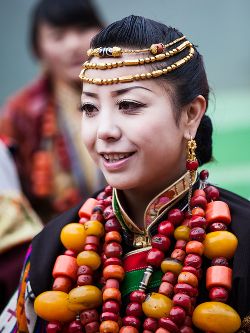 藏裝的基本特點是長袖、寬腰、大襟、肥大。直線寬邊,色彩對比強烈。男女藏袍均習慣以粗紡厚毛呢為料,左襟大,右襟小,一般在右腋下釘一個紐扣,或是用紅、藍、綠、雪青等色布做兩條飄帶,穿時結上。男式藏袍多為黑、白兩色,領圍、袖口、衣襟和底邊,鑲上色布或綢子底邊,古樸渾厚。夏天或勞動時,一般只穿左袖,右袖從后面拉到胸前搭在左肩上,也可左右袖均不穿,兩袖束在腰間,古銅色的皮膚袒露于外,雄風凜凜,彪悍剛健。女式藏袍,分有袖和無袖的兩種,夏秋兩季的藏袍無袖。里面多襯有紅、綠等色彩鮮艷的襯衣,襯衣翻領在外,衣袖要長于胳膊一至二倍,長出部分,平時卷起,舞蹈時放下,舒展飄逸,瀟灑自如。藏族的帽子式樣繁多,各地均有不同,拉薩等地以金寶頂帽為最多,用金絲或銀絲繡織圖案,在陽光照耀下,閃閃發(fā)光。金花帽是男女老幼都喜歡戴的民族帽。男女穿的藏靴,底高二寸,靴腰高至小腿以上,靴面用紅綠相間的毛呢裝飾,繡有圖案花紋。靴頭向上隆起。藏族男女喜歡佩飾。耳穿大環(huán),手腕金銀,頂戴珠鏈,尤其是在腰間,男挎長劍,女佩腰刀,更顯得粗獷彪美。