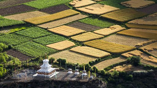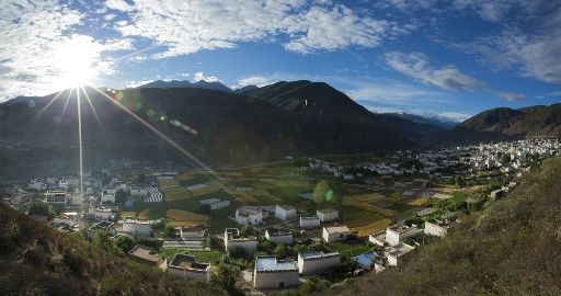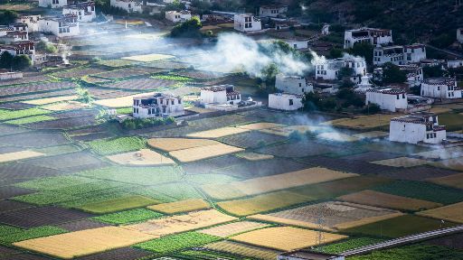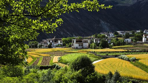 清晨,瓦藍(lán)瓦藍(lán)的天空云霧繚繞,周圍的景物一片朦朧,就好像童話里的仙境,一會兒,太陽從東邊冉冉升起,霧也漸漸消失,村子里屋頂上飄著裊裊煨桑的煙子,我站在山岡上從高處向下俯望,只見高山峽谷之中,層層翠綠的梯田簇?fù)碇l(xiāng)城特有的白藏房,山下的田野,就像一片金色的海洋,將秀麗的田園裝扮得更加如詩如畫。一陣晨風(fēng)吹過,麥田上蕩起了一道道金色的波紋,遠(yuǎn)處傳來了畫眉鳥的歌聲,我被眼前的一切迷住了,仿佛一切都靜止了,她讓我的夢從這里開始。