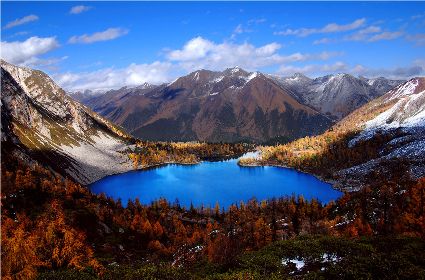 丹巴的秋是有著美麗色彩的季節(jié),你瞧,在峽谷兩岸的山巔,那一簇簇綠樹在一夜之間竟然點(diǎn)綴上了黃的、紅的顏料,就像是一名丹青能手不小心間打翻了調(diào)色盤,讓那些靈動的顏料在樹冠上潑灑。黃色的樹葉正印證了“滿樹盡帶黃金甲”的意境,黃得透徹,黃得潔凈。而那些紅色的樹葉,猶如盛開的鮮花,在逐漸蕭條的秋日里顯露出勃勃生機(jī)……那一片片黃紅綠相間的顏色,一寸一寸的往下挪移,讓看慣了春色綠野滿山的人們驚呼大自然的鬼斧神功之作。山腰,蔥綠的樹一棵連著一棵,密密層層,頑強(qiáng)地抵抗著秋風(fēng)的寥落,然而,那黃的紅的顏料終歸于要流向峽谷底,所經(jīng)之處,風(fēng)刺骨,葉瑟縮,大地又將再次被剝蝕掉華麗的外衣,露出山的嶙峋。我想,在山巔,那些樹葉在秋寒的作用下,依依不舍地與樹枝作別,隨風(fēng)抖落,在樹林中上下翻飛,猶如一只只美麗的彩蝶在林中翩翩起舞,當(dāng)落到地面上時,發(fā)出生命即將逝去時的低低嘆息聲,然而那哀傷卻沒有醞釀太久,幾只小蟲迅速地聚集在葉片底下,為尋找到過冬的庇護(hù)所而興奮不已,那些葉片也感受到了生命存在的意義,為自己即將化為塵土前還能再次發(fā)光發(fā)熱而激動。跟隨著秋的步伐,獨(dú)自一人穿行在秋色滿滿的樹林中。眼前,一片片落葉漫空飛舞,伸出雙手,讓那些黃的紅的葉片降落在手心里,一絲淡淡的蘋果香味從小小的葉片中透出,悠悠的在我鼻尖縈繞。那一片片落葉,不正是秋日向大地母親發(fā)出的明信片嗎!春夏兩季,大地母親用自己的乳汁哺育著這些葉片,泛著健康的綠色,渲染了大地,茁壯的成長。那透心的綠,將大地裝扮得格外的妖嬈,充滿了無限的活力。秋日漸近,它們在秋風(fēng)的浸透下,剝蝕掉綠色的外衣,消耗掉多汁的綠葉,逐漸的消瘦,最后薄如蟬翼,在秋風(fēng)的吹拂下,在大地母親的召喚下,終于脫離枝條,晃晃蕩蕩的飄向地面。