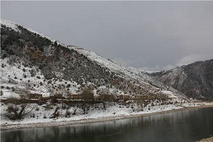 在接下來的路途中,停車休息的瞬間,一個(gè)臨水的村莊出現(xiàn)了。經(jīng)過昨夜的一場(chǎng)大雪,整個(gè)村子出人意料的“安靜”,河對(duì)岸牧民放馬的聲音,那個(gè)到河邊放下水桶汲水的女人取水的動(dòng)靜,似乎都被一場(chǎng)雪過濾了。我即使走到河邊,也難以通過耳朵和眼睛接近這一切。一幅無聲的畫面更貼近一場(chǎng)雪。我放下手中的相機(jī),似乎也在放下一些多余的東西,尊重著一種留白。