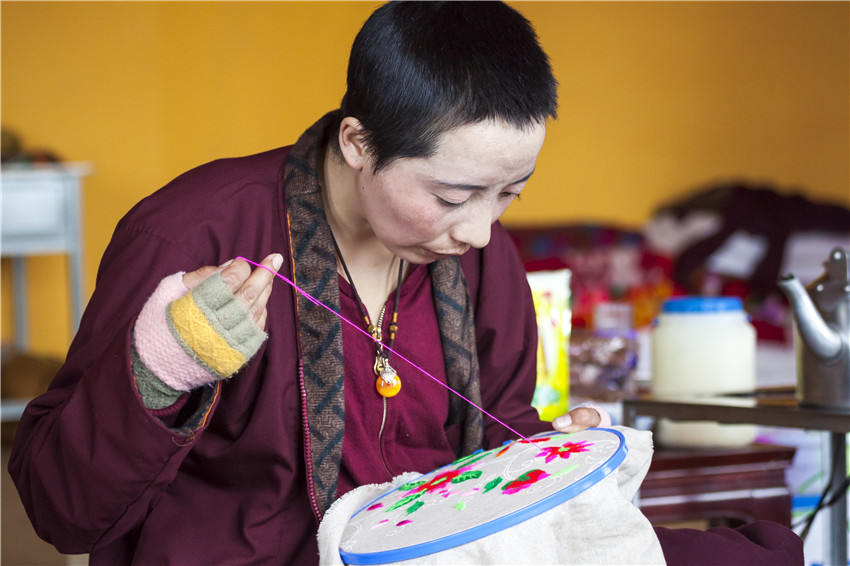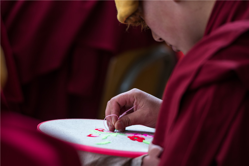 行攝途中經(jīng)過(guò)塔公鎮(zhèn)扎西寺,遇見(jiàn)康定市婦聯(lián)邀請(qǐng)到的中國(guó)國(guó)家級(jí)非物質(zhì)文化遺產(chǎn)藏羌織繡傳承人,正在為自愿報(bào)名的數(shù)十名覺(jué)姆傳授藏繡圖案基礎(chǔ)知識(shí)、藏繡圖案的常見(jiàn)表現(xiàn)形態(tài)、挑繡、納花繡、鏈子扣、扎花、提花、拼花、勾花和手繡等各種繡法技能。佛教的學(xué)習(xí)本是無(wú)止境的,我被這安靜、專注的場(chǎng)景深深感染,按下相機(jī)快門的一瞬就記錄了朵朵盛開(kāi)在指尖的蓮花。