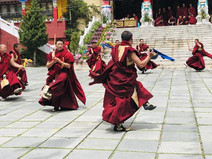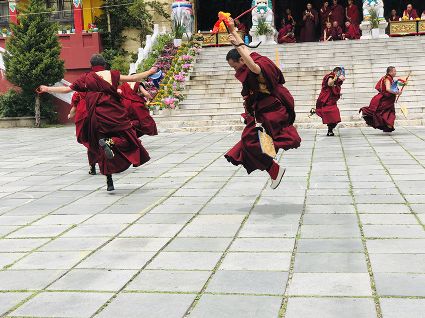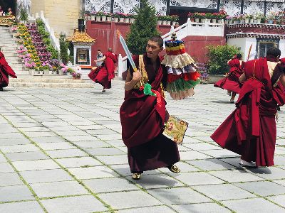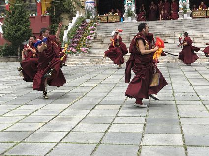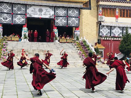 跳神儀式開始,南無寺內鼓號齊鳴,喇嘛身著顯耀盛裝,點燃新綠松枝,幾縷藍色煙紋升起。一支由法鼓、鈸、海螺、法號等組成的寺廟樂隊自大殿而出,順時針繞場一周落座場邊,群神出場繞圈而舞,以示凈化場地,祈請諸神入位。接著,象征護法神舞、骷髏舞、鹿神舞、黑帽咒師舞和金剛力士舞的演員手持各類法器挨個入場手舞足蹈。舞蹈的起落根 據場邊奏響的器樂節(jié)奏進行。最后由眾神驅鬼逐邪,押送“朵馬”(由糌粑捏成用以供神施鬼的食品)至寺外拋丟焚燒,以示驅逐一年的邪魔,祈禱來年安樂。