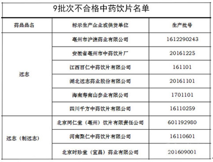 北京同仁堂(亳州)飲片有限責(zé)任公司、河南聚仁中藥飲片有限公司等企業(yè)生產(chǎn)的3批次遠(yuǎn)志(制遠(yuǎn)志)不合格,不合格項目為黃曲霉毒素。
