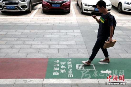 資料圖:西安街頭出現(xiàn)一條專為“低頭族”設(shè)計(jì)的通道。中新社記者 張遠(yuǎn) 攝