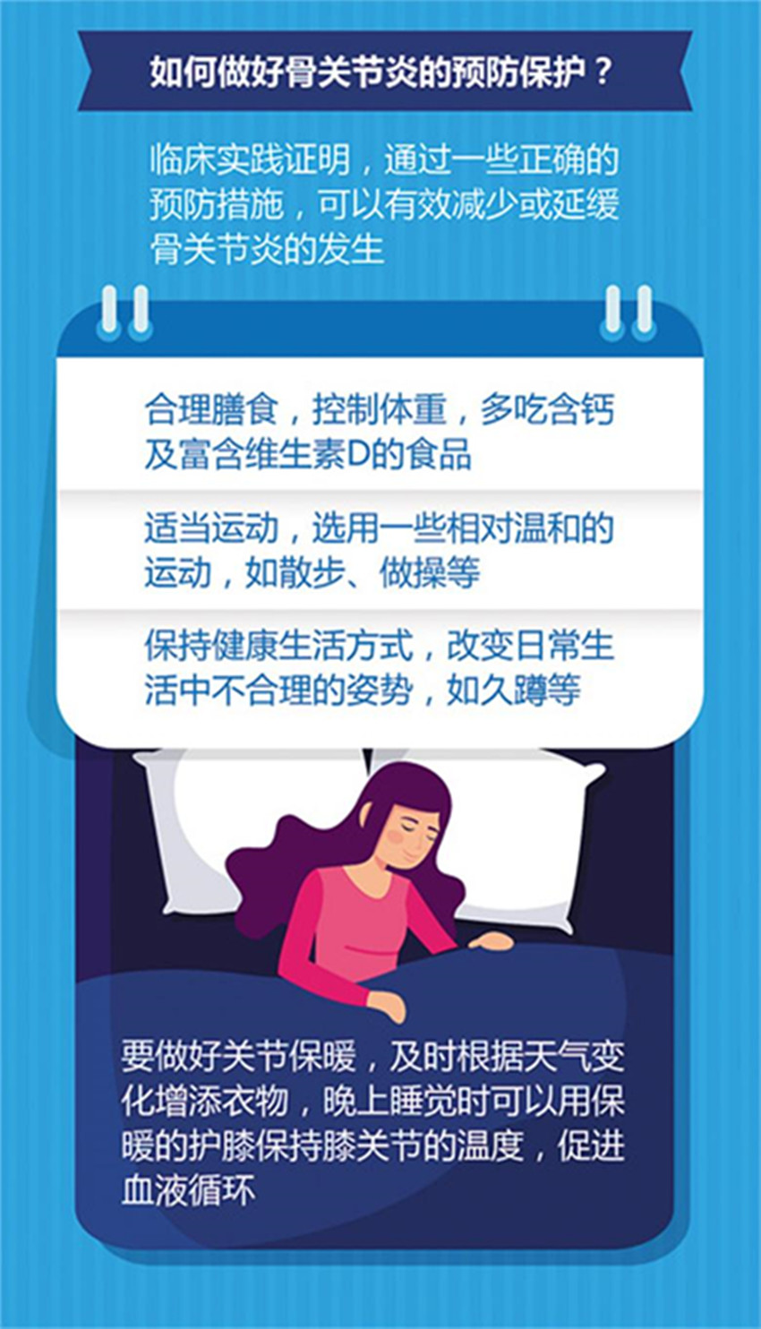 “首先是合理運動,包括運動形式與節(jié)律。”宋洋介紹,有患者認為得了關節(jié)炎就不能運動了,實際上,不運動反而會導致肌肉萎縮和骨質疏松,對關節(jié)不利。適量、正確的運動,不僅不會加重軟組織的損傷或關節(jié)炎癥,還會加強關節(jié)的穩(wěn)定性,預防關節(jié)軟骨的進一步損傷,減輕關節(jié)炎的癥狀,延緩關節(jié)功能退化。他強調,要避免爬樓梯、爬山、深蹲等對關節(jié)壓力較大的活動,推薦一些中等強度的運動形式,例如散步、慢跑、游泳、騎自行車等。在運動節(jié)律上,推薦養(yǎng)成規(guī)律運動的習慣,避免“沖擊劑量”體育鍛煉,特別是步入中年后、長期伏案工作的人群,一次突然的大劑量運動可能對關節(jié)造成嚴重的傷害。