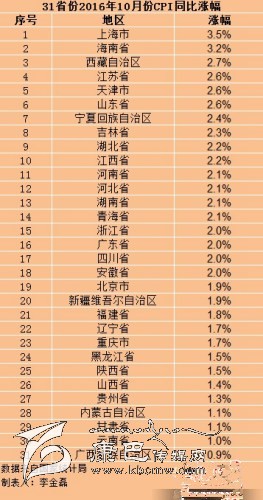 31個省份中,上海10月份CPI漲幅全國最高,為3.5%,漲幅比9月回落0.1個百分點。其次是海南,漲幅為3.2%。上海、海南也是目前全國兩個CPI漲幅處于“3時代”的地區(qū)。