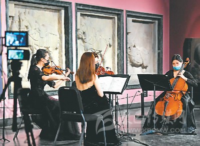 在西安碑林博物館昭陵六駿石刻前,西安交響樂團“弦上莫奈四重奏”為“云上國寶”音樂會彩排。