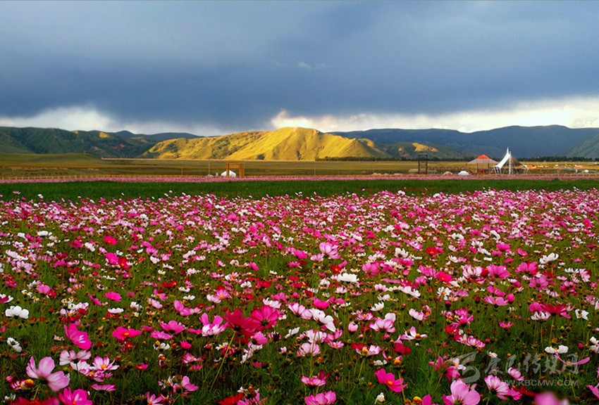 干凈、壯闊、深邃,藍(lán)天白云下,金露梅、波斯菊、峨眉薔薇……數(shù)十種花朵競(jìng)相盛放、爭(zhēng)奇斗艷,一陣細(xì)風(fēng)過(guò)后,群花緩緩搖擺,散發(fā)著縷縷清香。