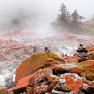 海螺溝的姊妹溝,位于海螺溝西北10 余公里的地方,周圍有15 座5000 米以上的高峰,從海拔2100 米逐次向上延伸至7556 米的貢嘎山主峰,目前還是一個(gè)鮮有人跡的地方。溝內(nèi)的景色原始自然,特有的紅石溝和奇溝內(nèi)的石頭千奇百怪,大面積的彩葉林帶更是秋天的寵兒。