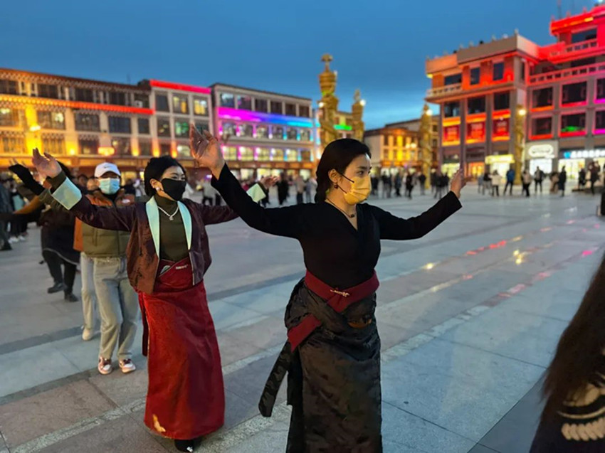 本網(wǎng)訊 每到傍晚時(shí)分,色達(dá)的金馬廣場(chǎng)上都會(huì)準(zhǔn)時(shí)響起起歡快的鍋莊曲。 舞者們雙手隨音樂(lè)自然張開,邁著輕快的步伐,踢腿、揚(yáng)手、轉(zhuǎn)圈。游客們有的拿起手機(jī)拍照留念,有的則加入鍋莊舞的隊(duì)列。
