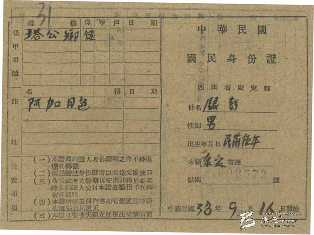 民國(guó)33年,即1944年,西康省民政廳制定《康區(qū)戶口清查辦法》,決定正式清查西康全省戶口。民國(guó)35年,即1946年,康定縣政府對(duì)康定全縣人口進(jìn)行統(tǒng)計(jì)。在1946年時(shí)候,全康定縣共8622戶、36797人,其中男性20889人、女性15908人(不含后重新劃歸康定管轄的所謂“金湯自治局”部分)。爾后開始發(fā)放“國(guó)民身份證”。發(fā)放工作斷斷續(xù)續(xù),延續(xù)數(shù)年,有的人領(lǐng)到,也有的人根本就沒(méi)看到過(guò)這種“國(guó)民身份證”。