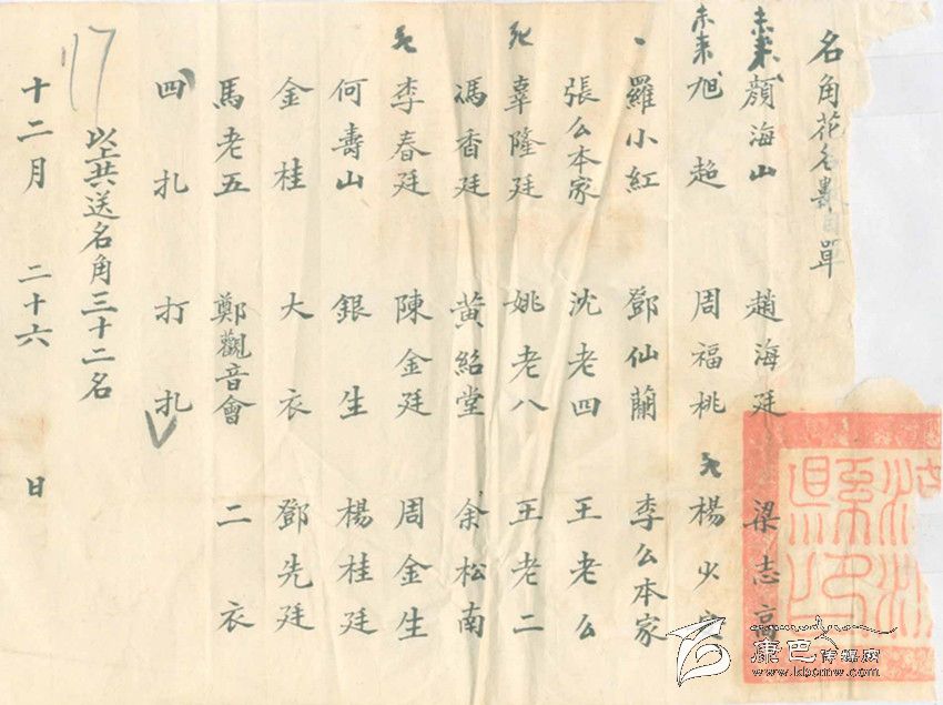 不準(zhǔn)賭博做什么呢?當(dāng)時的當(dāng)權(quán)者還是費了一番心思,他們從外地請來了一個川戲班子,為了吸引人們關(guān)注,康定縣政府把戲班的名角以及配角演員名單寫成海報張貼到街頭,又抄成傳單廣為散發(fā),用現(xiàn)在的話說是,做足了戲班出場前的前期宣傳工作。從名單上看,這是一個不小的戲班子,所謂名角竟有32名之多。想來對于沒有多少文化生活的康定民眾,還是有一定的吸引力。