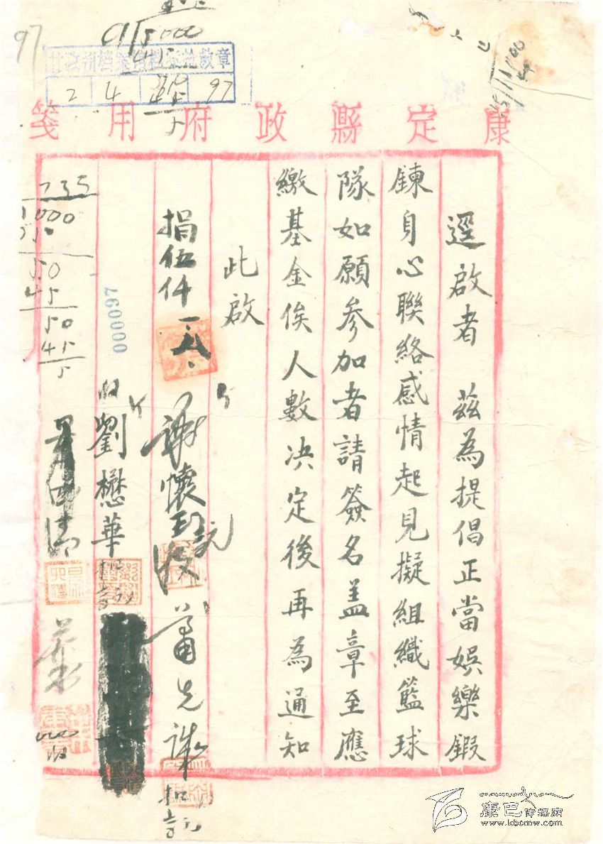 這是一張用解放前的康定縣政府便箋寫的“啟事”,內(nèi)容是倡議成立一支籃球隊(duì)。在上面簽字的有十多個(gè)人,這十多人一定是籃球運(yùn)動的愛好者。至于這支籃球隊(duì)后來是不是成立等等都不見下文。而且,從這張“啟事”上看不到這件事發(fā)生在哪一年,只有一位名叫李培清的人寫下了收到捐款5700元、“三月三十日”的日期。最有意思的就是,在這張“啟事”上記下了的這句話:縣長捐購籃球款伍仟元。這句話起碼包涵了以下的意思,一,康定城里已經(jīng)興起了籃球運(yùn)動;二,成立籃球隊(duì)沒有專門的經(jīng)費(fèi),幸好人們有很高的積極性,連縣長也主動捐款,那些簽名后面隱約可見的數(shù)字也可能是捐款的數(shù)字。