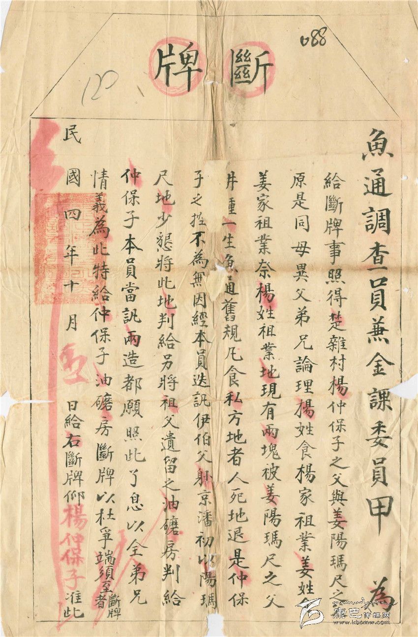 這張“斷牌”說的事情發(fā)生在“民國4年”(公元1915年),用今天的眼光來看應(yīng)算是一件“民事糾紛”。在一處地名“楚雜村”的地方,一個(gè)叫“楊仲保子”的人和一個(gè)叫“姜陽瑪尺”的人因?yàn)楦厮袡?quán)的事發(fā)生了糾紛。這兩個(gè)人其實(shí)是同母異父的兄弟。為了平息兩個(gè)人之間糾紛,也是為了保全兄弟情誼,又從公平角度出發(fā),甲調(diào)查員就把一處“油磨房”斷給“楊”姓所有。事情就這么斷了,為了防止以后再為這事發(fā)生糾葛,甲安仁調(diào)查員就發(fā)出了這樣一張可以作為“憑證”,其實(shí)是在當(dāng)年的那種情形下具有法律效力的“證書”。