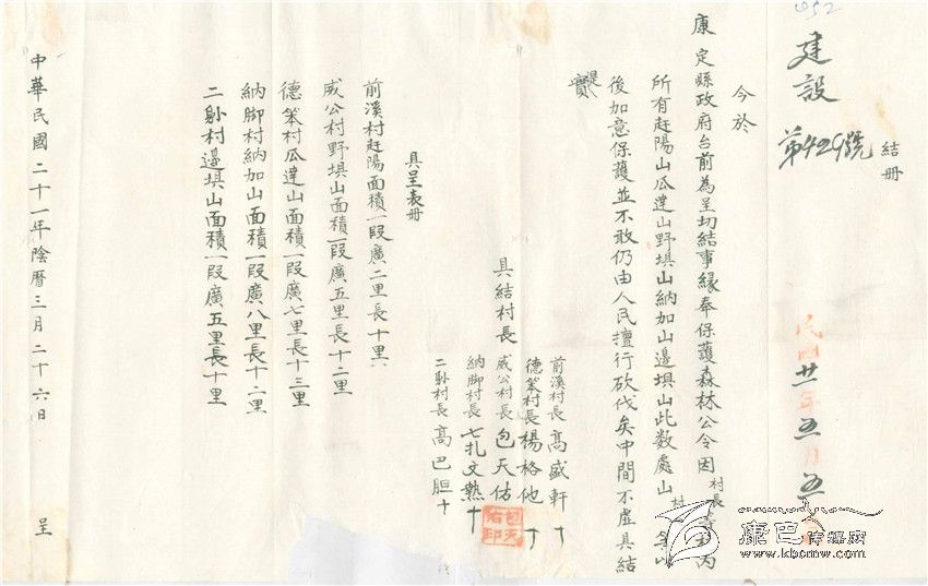 布告張貼出去后,大渡河流域康定縣屬的前溪、德笨、納腳、威公、二朗等五個(gè)村長(zhǎng)向縣政府寫出了由自己親自簽名畫押的“具結(jié)書”,把自己村落所在地的林林面積造出表冊(cè)“具呈”,并保證“以后加以保護(hù),不敢仍由人民自由砍伐”。