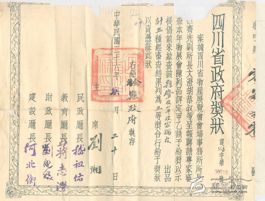 在公元1937年期間,當(dāng)時(shí)還是由四川省的實(shí)力軍閥劉湘在擔(dān)任四川省的主席,當(dāng)時(shí)四川省的民政廳、教育廳、財(cái)政廳、建設(shè)廳是承辦者,所以獎(jiǎng)狀就是以這些當(dāng)年的頭面人物所在機(jī)構(gòu)和他們的個(gè)人簽名發(fā)出。
