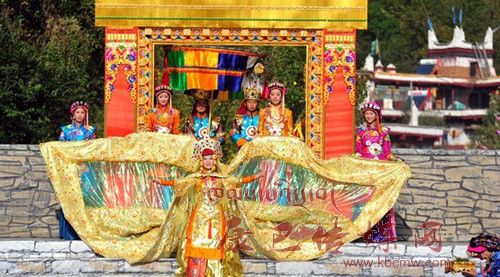 在催人奮進(jìn)的戰(zhàn)鼓聲中,一群身披甲胄的士兵拿著長劍,背著巨弓走到臺(tái)前,在鏗鏘的戰(zhàn)鼓聲中,戰(zhàn)士們做著各種競技動(dòng)作,模仿武士們互相攻擊的樣子,那矯健的身影展示了遠(yuǎn)古時(shí)代嘉絨藏族先民們?yōu)榱松媾c自然努力抗?fàn)幍膱?chǎng)景。過了一會(huì)兒音樂一轉(zhuǎn),戰(zhàn)鼓聲漸漸減弱,在鳥雀的陣陣啾啾聲中,一座木門慢慢的開啟,一位身披長袍、頭戴鳳冠的女王在眾多美女的簇?fù)硐?,緩緩走下臺(tái)階步入舞臺(tái)中央,此時(shí),一位手捧托盤的老者來到女王面前單膝下跪,將托盤高舉過頂,并邀請(qǐng)女王品嘗佳肴,女王將中指在酒中蘸了蘸,并曲起中指向四周輕輕彈去,寓意愿將杯中美酒與四方百姓同飲。在女王面前還放置著一個(gè)凈水桶,桶中盛滿了清澈的甘泉,桶上橫放著一枝柏樹枝,女王伸出纖纖玉手,拿著柏樹枝在水中蘸了蘸,面向墨爾多神山撒去,寓意向神山祈福。這是此次《美人谷·丹巴》節(jié)目展演中的序曲部分,有著強(qiáng)烈的東女神韻,將遠(yuǎn)古時(shí)代東女國女王遺風(fēng)展演的淋漓盡致。