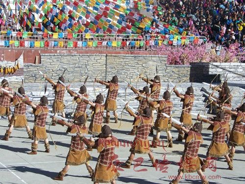 10月26日,在甲居藏寨,處處洋溢著豐收和歡樂的氣氛,人們扶老攜幼,身著節(jié)日的盛裝走到一起,來共同慶祝丹巴嘉絨風(fēng)情節(jié)的順利召開。在一塊空地中,搭建了臨時(shí)的舞臺(tái),看臺(tái)上,幾座古碉模型傲然挺立,在不遠(yuǎn)處,一座古碉矗立在一座小山包上,與古碉模型遙相呼應(yīng)、相映成趣。上午9時(shí)40分,當(dāng)節(jié)目主持人宣布嘉絨風(fēng)情節(jié)正式開始時(shí),一束束搖曳的煙花向空中飛去,在空中炸響后,散發(fā)出五顏六色的煙霧,其中有的還幻化成幾多小小的降落傘,就像多多盛開的鮮花在空中綻放。演出現(xiàn)場(chǎng)前的大地和遠(yuǎn)處的小山坡上到處都站滿了熱情的觀眾,合著禮花的爆裂時(shí)的響聲,將手中的小紅旗展開,高舉過頭頂,有節(jié)奏的左右搖動(dòng),霎時(shí)間,整個(gè)現(xiàn)場(chǎng)成為了紅色的海洋。