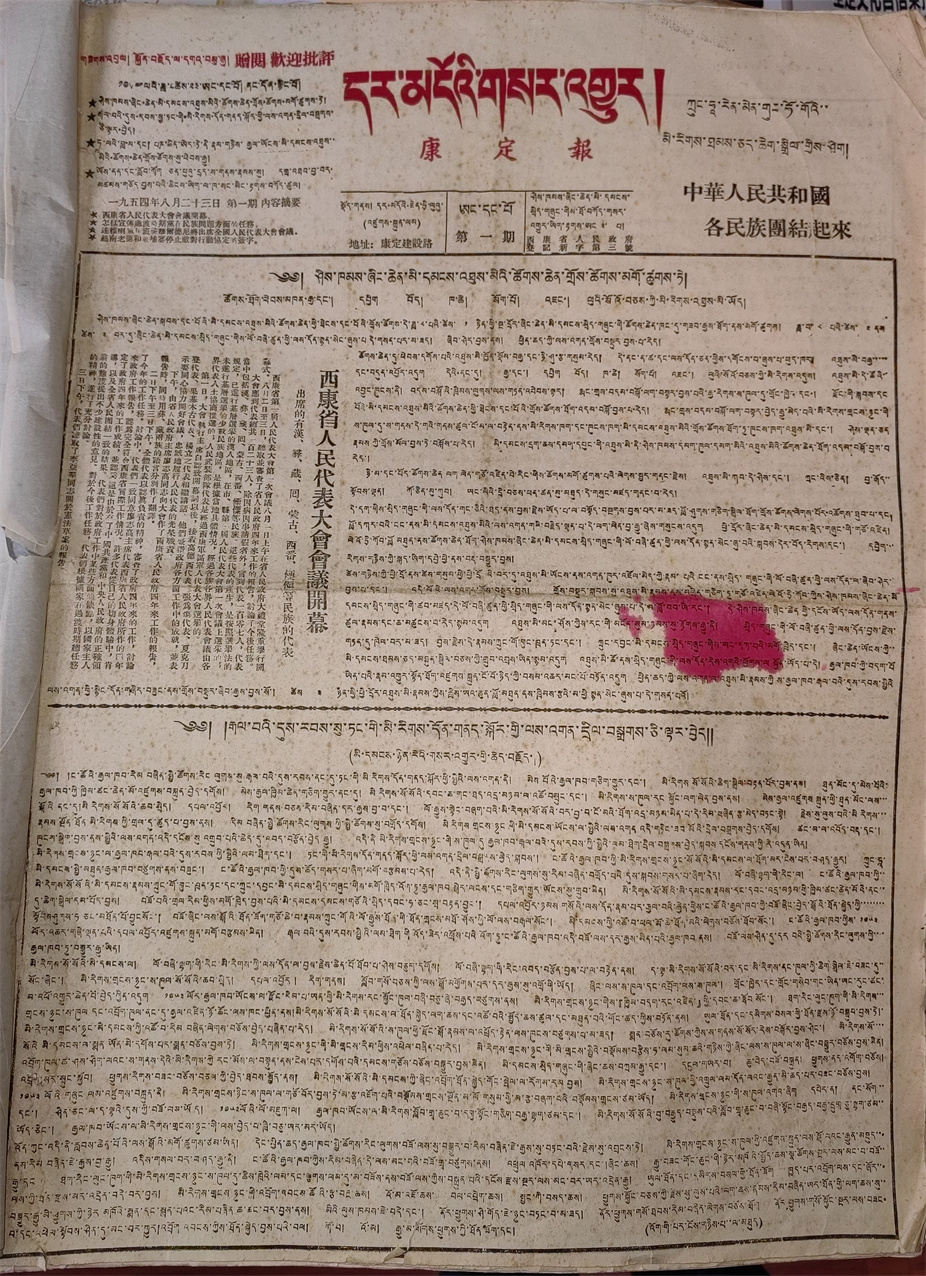 1954年12月以前出版的《康定報(bào)》,刊期不定,版數(shù)不定,刊期長時(shí)達(dá)17天一期報(bào)紙,短時(shí)7天一期報(bào)紙;版面有時(shí)是對(duì)開四版,有時(shí)是對(duì)開二版。1954年12月10日以后,基本上能十天出一期報(bào)紙,1955年1月以后改為周刊。西康省與四川省合并后,經(jīng)四川省委宣傳部批準(zhǔn),《康定報(bào)》從1956年1月起,正式改為周五刊。改刊初期,每期報(bào)紙每個(gè)版都用藏、漢文對(duì)照排版。后來又改為藏、漢文分別組版,即一、二、三版為藏文,四版為漢文。