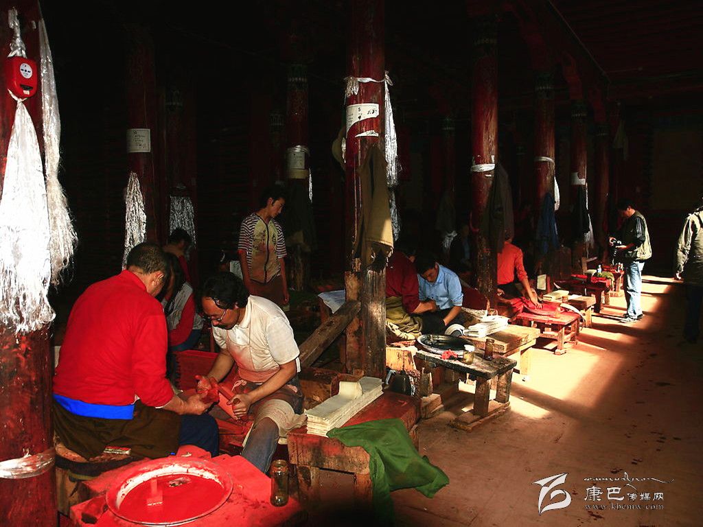 德格印經(jīng)院的各種傳統(tǒng)產(chǎn)業(yè),當(dāng)?shù)鼐用竦纳a(chǎn)勞動都立足于當(dāng)?shù)刈匀画h(huán)境資源,并且全面地支持著傳統(tǒng)印刷技術(shù)系統(tǒng)的各階段。包括“瑞香狼毒”的草根造紙方法,均與德格地區(qū)的傳統(tǒng)產(chǎn)業(yè)有關(guān)。藏紙是當(dāng)?shù)鼐用裼脗鹘y(tǒng)手工方式制造的印刷紙,是用一種叫“阿交如交”(瑞香狼毒)草本植物根須為原料制造而成。這種紙的顏色微黃,質(zhì)地較粗厚,但纖維柔軟,不易脆,吸水性強(qiáng),同時還具有防蟲蛀、防鼠咬,久藏不壞的特點(diǎn)。印經(jīng)院的印刷用色通常分為紅版和墨版兩種。木刻印版的刻制工作更為艱辛,印經(jīng)院選聘藏文知識高深淵博的名士將所要刻制的圖書進(jìn)行嚴(yán)格細(xì)致的三級審校,才可由聘請的藏文書法技藝精深的學(xué)者嚴(yán)格按照藏文書法正楷要求開始橫版書寫工作,他們將圖文描繪在半透明的薄紙上反貼在板面上??坦円罁?jù)紙上的色差進(jìn)行刻制,刻完后編師們在清樣上還要進(jìn)行三校,版面改動較多的必須進(jìn)行重刻,一般的進(jìn)行補(bǔ)刻。直至完全準(zhǔn)確無誤時將印版放在酥油里浸泡一天后,取出曬干,再用一種名叫“蘇巴”的植物根熬水洗凈曬干,至此一塊印版的制作才算全部完成,可入庫上架和進(jìn)行印刷。通常情況下,技藝嫻熟的一名工人每天完成一張書版的單面刻制,畫版刻制工作量更大。雕刻技工都是來自本地及周邊地區(qū)的民間藝人。