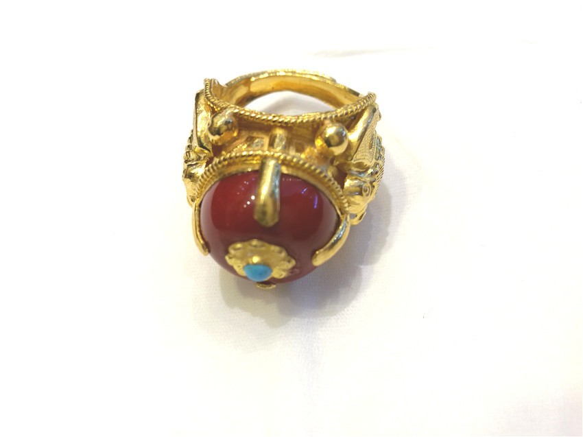蜜蠟是藏家裝飾中的上成品,藏民族對(duì)蜜蠟的喜愛是非常誠(chéng)懇的,表達(dá)著他們對(duì)大自然的無限崇敬之情與大自然饋贈(zèng)的感謝之情。在他們看來,蜜蠟除了能夠作裝飾品佩戴、收藏之外,最引人注目的就是靈性修行之功效,設(shè)計(jì)師在此款戒指的設(shè)計(jì)上,緊扣藏民對(duì)蜜蠟的喜愛,并將漢式花邊與蜜蠟結(jié)合,是對(duì)藏漢文化交流較好的體現(xiàn)。