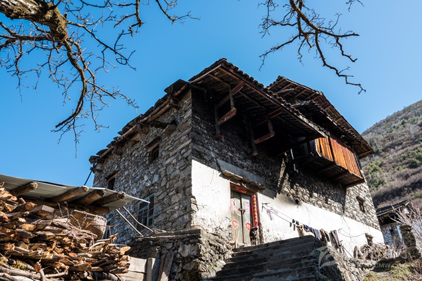 魚通人的房屋符合古人對(duì)居所背山面水的要求,多依山而建。房屋為木石混合結(jié)構(gòu),以片石木材和黃泥為主要材料建成,當(dāng)?shù)厝朔Q之為“碉房”。房屋用石塊壘起,以木頭為墻筋,每隔一定高度,橫砌進(jìn)入石塊,融為一體,使之更為堅(jiān)固牢靠?!暗锓俊?/span> 一般為三層或四層,呈四角或六角形。底層為關(guān)牲畜。第二層為“堂屋”, 在過去,是集做飯、吃飯、烤火、家人日?;顒?dòng)為一體的場(chǎng)所,地上設(shè)有火塘、灶,并在火塘上設(shè)石制三腳鍋莊或鐵三腳。第三層為各居室,有的設(shè)有貯藏室和會(huì)客屋。頂層為經(jīng)堂,室外為曬壩,作打場(chǎng)、曬場(chǎng)用。有些在外側(cè)設(shè)有一小吊腳樓,可堆放雜物。隨著時(shí)間的流逝,古老的碉房已無(wú)法滿足現(xiàn)在居民的需求,已很少有人居住,而新式碉房在傳統(tǒng)的基礎(chǔ)上開始出現(xiàn)。