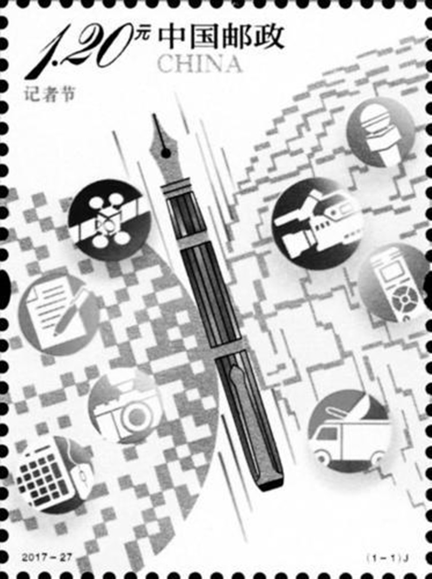 為紀念第18個記者節(jié)。中國郵政定于2017年11月8日發(fā)行《記者節(jié)》紀念郵票一套1枚。郵票圖案采用了具有現(xiàn)代感的構(gòu)成手法及色彩表達方式。畫面中的鋼筆象征了記者秉持弘揚民族精神、維護國家利益和社會責(zé)任的專業(yè)精神和自信風(fēng)范。兩側(cè)的線條及方點構(gòu)成的兩個圓形圖案分別隱喻地球和現(xiàn)代網(wǎng)絡(luò)體系,表示在新媒體時代,新聞傳播媒介所呈現(xiàn)出的多元化、全球化的發(fā)展態(tài)勢。畫面中麥克風(fēng)、攝像機、錄音筆等形式各異的采編設(shè)備圖標,結(jié)合衛(wèi)星及地面發(fā)射站等元素,突出了當(dāng)代記者巨大的社會影響力。同時,鋼筆和兩側(cè)的圓形圖案共同組成了一只振翅飛翔的蝴蝶形象,喻意了記者追求至善至美,在探訪報道中擔(dān)負著傳播先進文化,引領(lǐng)和維護和諧社會,推動人類文明的崇高使命和社會責(zé)任。