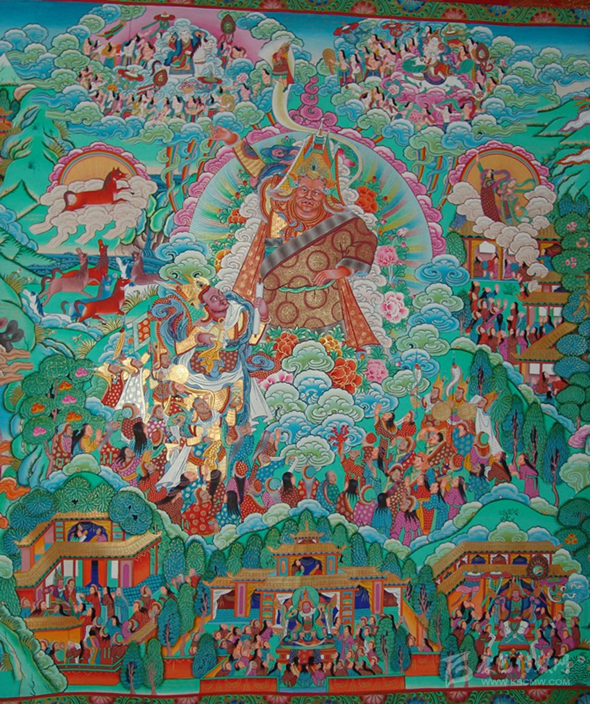 格薩爾唐卡,藏語叫“仲唐”?!爸佟奔础陡袼_爾》故事;“唐”即唐卡,“仲唐”就是畫有《格薩爾》內(nèi)容的唐卡畫。那么,唐卡與古老的藏族英雄史詩《格薩爾》之間又有什么聯(lián)系呢?作為民間文學的史詩《格薩爾》主要靠民間藝人的說唱得到繼承和廣泛流傳。為了加強說唱時的效果,一些聰明的藝人就以《格薩爾》為題材,繪制人物畫和格薩爾故事,類似佛教繪畫中的佛本生故事和高僧大德的畫傳,說唱時把它們懸掛起來,邊解釋,邊演唱。這種演唱形式,被稱作“指畫說唱”。這就是有關《格薩爾》最早的唐卡。“一畫一世界”,在說唱藝人們看來,在一幅并不很大也算不上很精美的唐卡里,整個大千世界、英雄格薩爾的輝煌業(yè)績,都包括在里面了。久而久之,成為一種專門的類型,稱作“仲唐”——畫有格薩爾故事的唐卡。