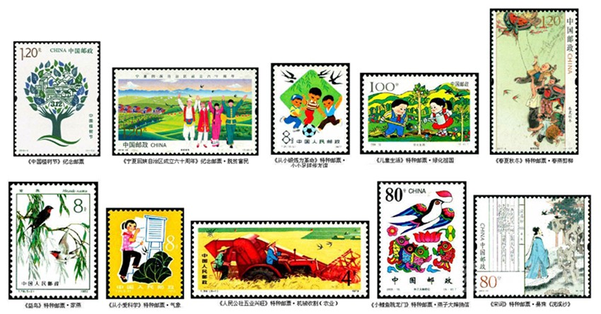 2019年3月12日,中國郵政發(fā)行《中國植樹節(jié)》紀(jì)念郵票,圖案主體是意為雙手托起的綠色家園的一株枝繁葉茂的參天大樹,樹干枝頭上方層層綠葉中設(shè)計點綴了象征城鎮(zhèn)、鄉(xiāng)村、河流、山川、藍(lán)天白云等符號化圖形,其中就有兩只飛燕。寓意通過全民植樹造林活動,改善生態(tài)和生活環(huán)境,共同創(chuàng)造綠水青山的美麗中國。郵票中出現(xiàn)燕子象征大自然的生態(tài)美還有一枚即2019年9月19日發(fā)行的《寧夏回族自治區(qū)成立六十周年》紀(jì)念郵票,其中第二枚“脫貧富民”,圖案展現(xiàn)了寧夏大地的青山綠水,一派生機盎然的景象,在歡呼的人群上空就飛翔幾只燕子。