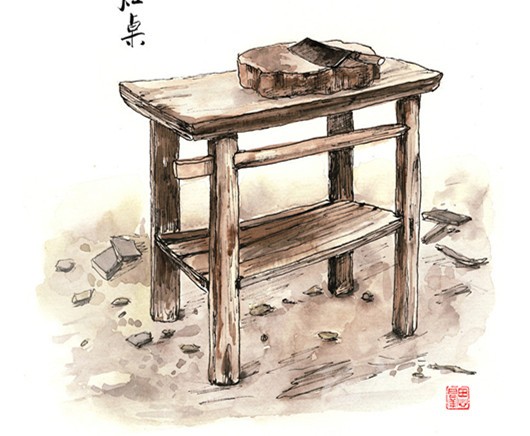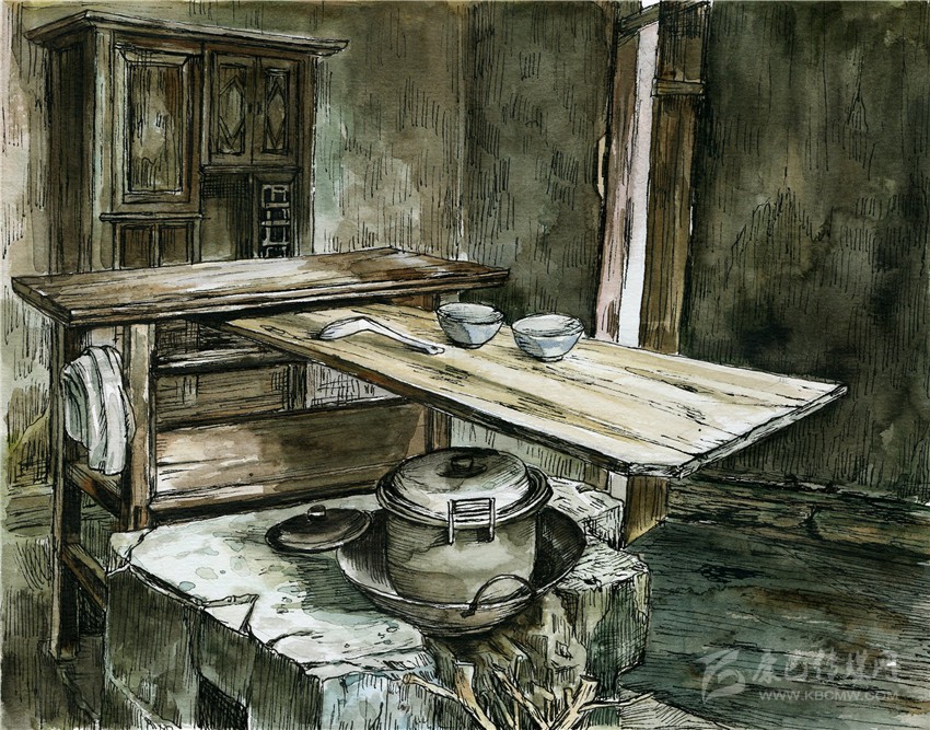 在我們家,灶屋里砌著一個四方形兩灶孔的大正灶,兩條寬板長凳靠墻擺放,交于墻角,像木匠的大曲尺,半圍著象征一家之主的正灶,其中一條正對著灶門口。灶與凳之間的通道,僅容曲膝而坐。灶上常年擱著烏黑的鼎灌和鐵鍋,灶的背面則立著一張長條狀的灶桌。灶桌是洗碗和切菜的地方,在其橫長的縫隙里插上接手板,懸空于灶面之上,擺上碗筷,又起到了飯桌的功能。灶屋進門的另一面墻,靠墻而立的,是高高的碗欃和一個瓦水缸。碗欃是平素放碗放剩菜的地方,本是漆了老紅色,卻因西墻的木格窗小,光線幽暗,與四壁及樓板的烏黑融為了一體。水缸上口有一塊擱板,板上放兩只寬口瓦缽,缽里各放著一只竹筒水勺,一大一小。每天早晚,家人擔(dān)了木桶,挑來井水倒入水缸,此處的地面,長年潮濕。灶屋是我們一日三餐吃飯喝茶休息閑談的場所,煙火歲月,多是在此度過。我開蒙上小學(xué)后,每到夜晚,吃過飯后,將煤油燈盞移到寬板長凳,雙膝跪地,伏在凳灶之間的空隙里寫作業(yè),有時一不小心,額前頭發(fā)就被燈盞的火焰燒得焦臭。我自小愛學(xué)習(xí),成績很好,每學(xué)期都有獎狀,老師夜里來村間家訪時,也常來我家坐,是我父母最大的榮光。