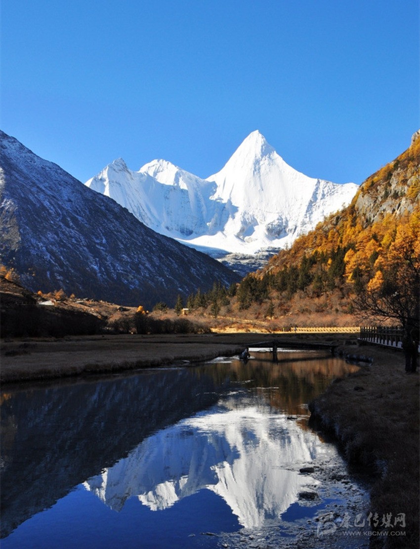 央邁勇,意為“文殊普薩”,海拔5958米,是“三怙主神山”的南峰;狀若一位斜倚在大榻上笑對(duì)世界的閑靜處子;在佛教中是智慧的化身。1928年,當(dāng)美國(guó)探險(xiǎn)家約瑟夫·洛克先生在云南與稻城毗鄰的崇山峻嶺中遙望央邁勇時(shí),一種被它圣潔、高貴的氣質(zhì)所折服的情感也隨之降臨了;他在日記中由衷感嘆,“央邁勇是我見到的世界上最美的山峰”。