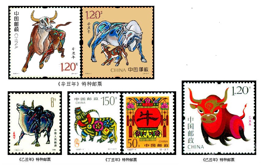 1997年1月5日發(fā)行第二輪生肖郵票中的“牛票”,即《丁丑年》特種郵票,全套2枚。由郵票設(shè)計(jì)師呼振源設(shè)計(jì)。第一枚“金牛奮蹄”,畫面依據(jù)山東省高密縣方市鄉(xiāng)前曹戈莊村當(dāng)時(shí)33歲的農(nóng)村女子齊秀花的剪紙作品《媳婦騎牛圖》進(jìn)行設(shè)計(jì),原作中的“媳婦”被刪去,突出了牛的形象,體現(xiàn)出膠東地區(qū)民間剪紙藝術(shù)源于生活、構(gòu)思巧妙、粗獷中多見細(xì)膩的本色。只見那彎彎的牛角,垂地的長尾,壯實(shí)的牛身,穩(wěn)健的四蹄,都真實(shí)地再現(xiàn)了生活中牛的特點(diǎn),牛身上似花非花,似銅錢又非銅錢的紋飾,充分地表現(xiàn)出樸實(shí)的浪漫主義。第二枚“牛耕年豐”,畫面主圖為一只高高掛起的大紅燈籠上,映出了一個(gè)醒目的隸書“?!弊?,為牛年的慶春象征。圍繞著這只燈籠,又進(jìn)行了幾多創(chuàng)意,兩只喜鵲和一朵梅花,喻意“喜鵲登梅”;旒蘇上的兩朵牡丹,代表幸福、富貴;特別是那春意盎然的“雙牛圖”,畫面雖小,確為點(diǎn)睛之筆,與主圖的大“?!弊志o密呼應(yīng)。
