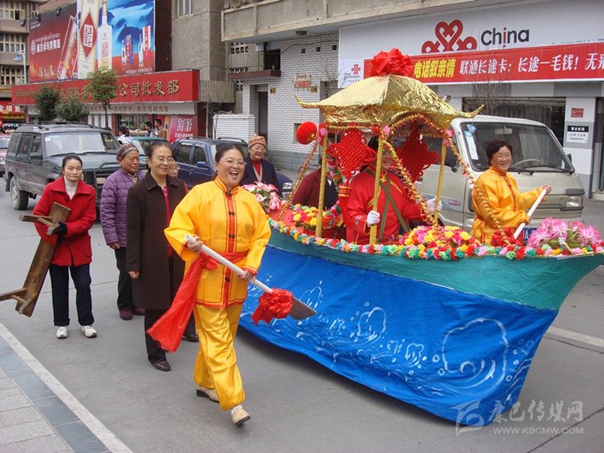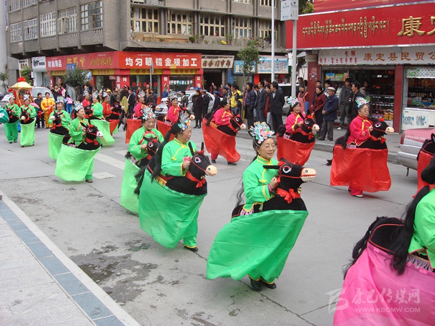 半個世紀(jì)風(fēng)靡康定城的“船燈”、“馬馬燈”、“鬧山鼓”、“扭秧歌”、“笑頭和尚戲柳翠”、“霸王鞭”……整個兒就像老陜過年時的“社戲”場面。大年初一、十五夜“出燈”游街,熱鬧氣氛把整個年節(jié)塞得滿滿的。記得我孩童時見過一次“出燈”游行,不是晚上而是在大白天(叫“出游”)。寺廟喇嘛吹奏佛樂走在前面,接著是“川北”人的川劇鑼鼓;再后面跟著的就是“馬馬燈”、劉老陜的“船燈”、鐵木社的“龍燈”、二輕局的“霸王鞭”、南門上的弦子隊、三居委的腰鼓隊、北三巷的“道孚鍋莊隊”……游行隊伍遇街口寬敞地方必圍圈演出?!叭死侠玻死侠?,人老先從頭上老,白的多來黑的少, 開——船——羅!”“銀須飄灑”的艄公劉老陜用俏皮逗趣的陜腔告白開場詞,在歡喜鑼鼓的伴奏中“劃”著旱船出了場。旱船闖“急流”、過“險灘”,風(fēng)趣又逼真;如果哪家的姑娘打扮成古裝戲里的嬌美仕女坐上旱船游了街,那她立馬就成了康定城人皆贊譽(yù)的“美女”。接著就是“馬馬燈”,幾十個“騎馬橫槍”的古裝將士馳騁上場,排兵布陣,穿梭并行,“馬”鈴聲鼓樂聲交織一起……鬧翻了康定城的“三山二水”。