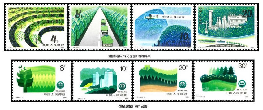 1980年3月12日,我國第一個(gè)植樹節(jié),中國郵政發(fā)行《植樹造林,綠化祖國》特種郵票,全套4枚。第一枚“經(jīng)濟(jì)林”,圖案是生長有序的梯田式的經(jīng)濟(jì)林林業(yè)基地。第二枚“四旁綠化”,即在宅旁、村旁、路旁和水旁因地制宜有計(jì)劃地種植經(jīng)濟(jì)林木以綠化城市、美化環(huán)境、護(hù)路護(hù)堤、凈化空氣以及為社會(huì)創(chuàng)造財(cái)富,圖中寬闊的道路兩旁綠油油的樹令人心情舒暢。第三枚“飛播造林”,圖案是在翠綠的群山間一架飛機(jī)正在向山嶺撒播樹種進(jìn)行造林,在飛機(jī)拉出的煙霧中有“植樹造林,綠化祖國”八個(gè)字,體現(xiàn)了我國植樹造林走全民動(dòng)員和現(xiàn)代化的道路。第四枚“廠礦綠化”,廠礦置于一片綠色海洋之中,形成了美麗的園林化廠區(qū)。