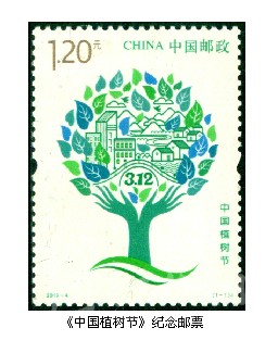 2019年是中國的植樹節(jié)設(shè)立40周年。3月12日,中國郵政發(fā)行一枚《中國植樹節(jié)》紀(jì)念郵票。郵票畫面以綠色為基調(diào),圖案主體為雙手托起的綠色家園,手臂代表樹干、張開的五指代表樹枝,寓意大家親自動(dòng)手,植樹造林,為改善生活環(huán)境做出一份貢獻(xiàn),同時(shí)也寓意人類是肩負(fù)改善地球環(huán)境重任的主要力量。樹干枝頭上方是生機(jī)盎然的綠葉,層層綠葉中設(shè)計(jì)點(diǎn)綴了象征城鎮(zhèn)、鄉(xiāng)村、河流、山川、藍(lán)天白云、飛鳥的符號(hào)化圖形,寓意通過全民植樹造林活動(dòng),改善生態(tài)和生活環(huán)境,共同創(chuàng)造綠水青山的美麗中國。