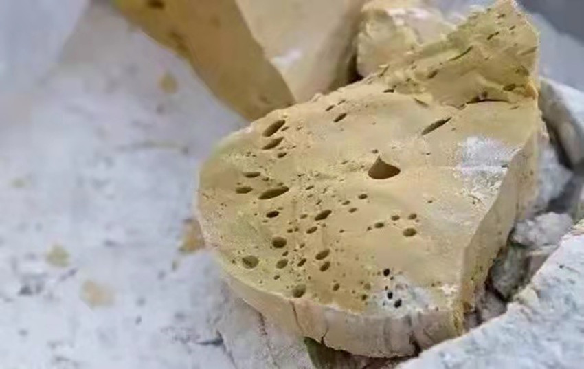 扯糖也是熬糖過程中十分關(guān)鍵的一個(gè)環(huán)節(jié)。剛出鍋的糖溫度可達(dá)兩三百度,徒手是不敢去觸碰的,扯糖需等到麻糖變得溫?zé)岵拍苓M(jìn)行,但又必須在它完全冷卻之前完成整個(gè)扯糖工序,否則等麻糖徹底冷卻就會(huì)變得僵硬無比。休息少頃,只見三叔熟練的用粘著面粉的手從盛放麻糖的簸箕中扯下三四斤左右的一團(tuán)麻糖,左手拿糖右手持杖(類似于搟面杖的木棍)作出扯糖的姿勢(shì),此時(shí)四叔拿著早已準(zhǔn)備好的沾了面粉的木棍將三叔的手中的麻糖攔腰別住,用力均勻的拉扯麻糖,三叔則在原地扎樁站穩(wěn),一手持杖作拉扯狀,一手微微扶住想要往下掉的糖尾,經(jīng)過幾次折疊和來回拉扯,麻糖變得均勻細(xì)長(zhǎng),兩人合力將扯好的麻糖平穩(wěn)的放在鋪有熟面粉的大簸箕中靜待冷卻。間隙二叔和父親又重復(fù)著扯糖的動(dòng)作,很快將一團(tuán)糖餅扯成糖帶。經(jīng)過拉扯后麻糖中間會(huì)形成很多的空洞,吃起來酥脆香甜。