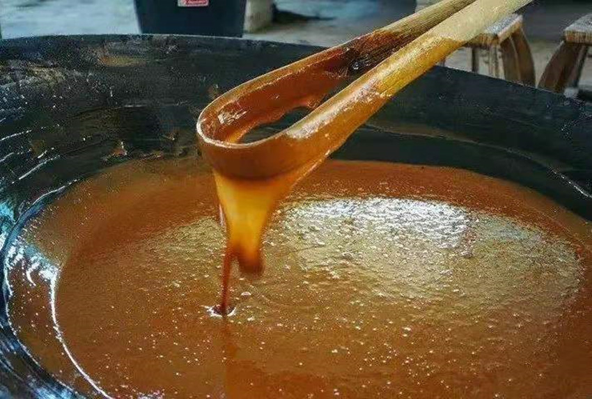 姐姐做好了午飯,我也完成了燒火任務(wù)。母親退掉了灶里燃燒的柴火,留下猩紅的火炭,將一瓢早已準(zhǔn)備好的麥芽漿倒入煮好的漿糊中,加水?dāng)嚢杈鶆蚝箪o置。直到吃完午飯,我們即將出發(fā)去大伯家時(shí),我看到鍋里的漿糊上面析出一層透明的液體。此時(shí)母親又點(diǎn)燃了灶火繼續(xù)熬煮兩鍋漿糊,煮開后進(jìn)行過濾。再將濾出的糖水倒入洗凈的大鍋中熬煮。