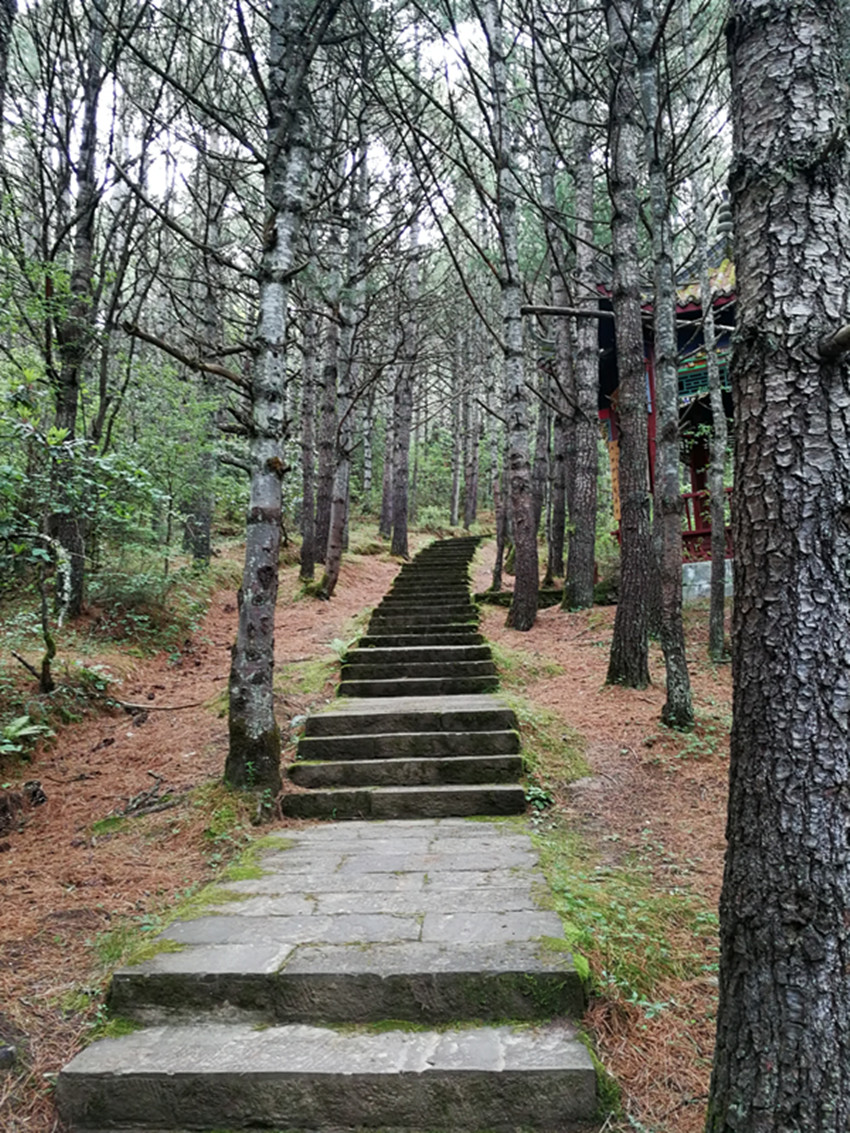 跑馬山腳的國道過境公路康定人都叫它后山公路。在后山公路觀音閣上行百米遠地方,離公路坎三十公尺遠近,有一處突兀于山坡樹林的巖頭,晃如一只臥獅探出的頭,那巖頭就是跑馬山獅子巖。此獅子巖自然不是彼獅子巖了。去四道巖的小徑就要從獅子巖傍邊經(jīng)過。那巖頭下如獅子的下頜處人為的砌了一個土石混合的條狀臺階,從我記事起就知道上面經(jīng)常供有一些食物瓜果紙張之類的供品。當然那時候我們也常常把花紅、梨子放在那臺上,以示敬神。但具體敬的什么神靈或土地老仙,我則從未想過,這差不多就是一個習俗而已。