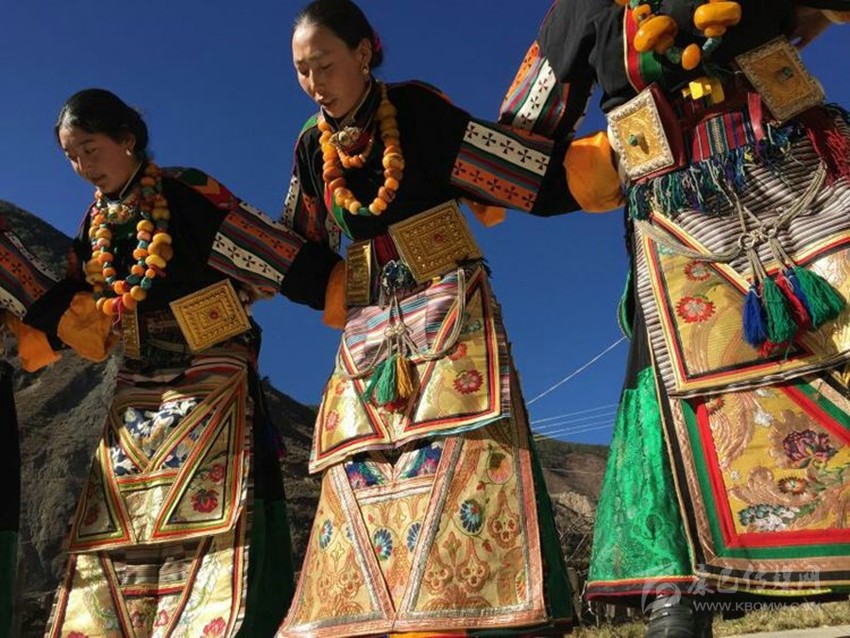 蒙自鍋莊服飾獨(dú)特,屬東義服飾類。稻城東義女式服飾感覺與鄉(xiāng)城瘋裝有些相似,融合了納西族女裝和稻城土裝的元素,一是折疊多、折疊數(shù)是固定的,內(nèi)折和外折各54個,左右胸襟分別以紅黃綠黑等顏色的料子鑲拼而成,分別代表財(cái)富、福壽、牲畜、先知、土地。男式服裝比較簡便,突出之處就是系在腰間的彩帶。