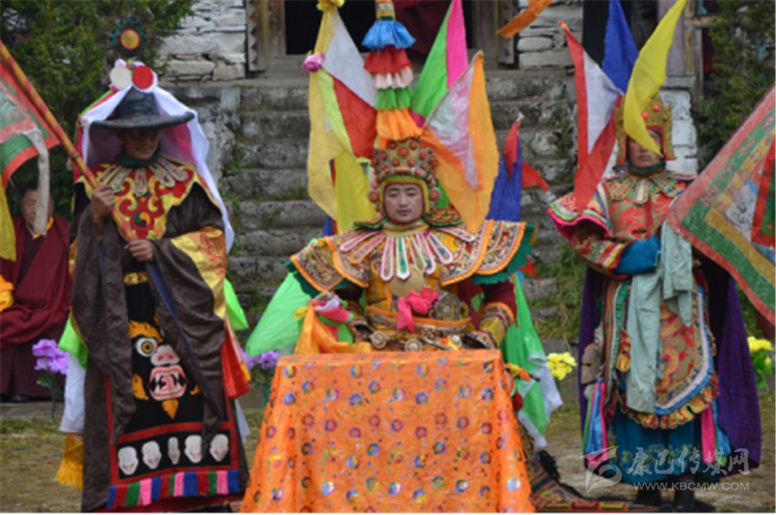 思路還是回到戲劇問(wèn)題上來(lái),在我以往欣賞的藏戲,其演出場(chǎng)所都設(shè)在露天,演員和觀眾在同一平臺(tái)的草地上,有時(shí)在平臺(tái)四周有山坡,那便是觀眾最好的看戲處。不過(guò),從高處往低處看,效果還是不及平視的效果好。表演藏戲的舞臺(tái)在草地中央,觀眾圍著中央草地形成一個(gè)半包圍圈,演出幾乎沒(méi)有布景,即便有,也是簡(jiǎn)單的一些桌椅、祭臺(tái)之類(lèi)的簡(jiǎn)單道具。在演出中,一個(gè)演員身著各類(lèi)色彩鮮艷的帽、旗及其盔甲服裝等大于人體體型的飾物,這樣做的目的顯然是為了增強(qiáng)演出的鮮明性,尤其演員穿著厚底高靴,體型龐大,頭戴面具,嗓音洪亮,動(dòng)作凝重而富有節(jié)奏,使整個(gè)演出富有較強(qiáng)的穿透力和沉重感。藏戲的音樂(lè)也比較簡(jiǎn)單,主音節(jié)奏依靠長(zhǎng)號(hào)、大鼓、鈸等,曲目轉(zhuǎn)換時(shí)則多以笛子演奏,間或插入海螺聲、嗩吶聲等。整個(gè)藏戲的故事情節(jié)則是依靠舞蹈和合唱來(lái)漸次推進(jìn)的。藏戲作為祖國(guó)文化大家庭中的成員之一,自然有著自己獨(dú)特的特點(diǎn),有著屬于自身的文化藝術(shù)和生活土壤的傳承因子。藏戲誕生在一個(gè)特殊的環(huán)境里,它既在風(fēng)格、形態(tài)、特征和韻致上包含著與其他戲劇相似的共通性,同時(shí),它又蘊(yùn)涵著與眾不同的自身的內(nèi)涵特征??傊?,藏戲在“歌、舞、劇、技等方面的有機(jī)結(jié)合,虛擬寫(xiě)意的表現(xiàn)型戲劇,程式化表演手段,自由靈活的演出時(shí)空概念,??????它又具有與古希臘戲劇很類(lèi)似的貫穿始終的講解人和伴唱伴舞隊(duì),面具表演,三面以至四面觀眾的廣場(chǎng)演出,一部分生活化寫(xiě)實(shí)表演,演出時(shí)空的間接固定場(chǎng)景,史詩(shī)式講唱文學(xué)的劇本結(jié)構(gòu)和說(shuō)唱藝術(shù)的演出格式等特殊之處?!薄緞⒅救骸吨袊?guó)藏戲史》4頁(yè)】因此,在藏戲的諸多元素中,我們可以看到顯著的特征,這就是明顯的原始巫文化和原始苯教文化的痕跡,無(wú)論是在藏戲的臺(tái)詞、面具和服飾中,還是在藏戲的音樂(lè)、樂(lè)器和表演形式上,不難看出藏戲的這一本土特征,至于與其他戲劇流派的類(lèi)似之處,我以為,一方面是戲劇本身固有特征的表現(xiàn),另一方面或許是一種合理吸納所致。